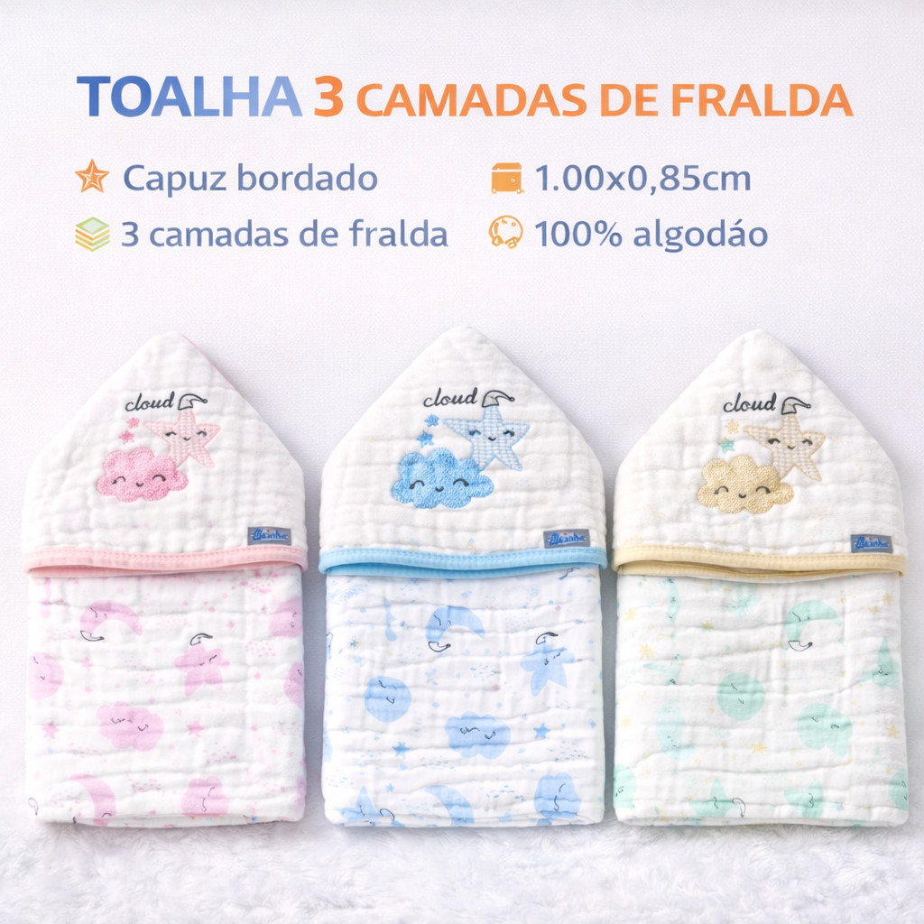 Toalha de Banho Bebê com Capuz bordado | Soft Premium 3 Camadas Super Absorvente 1,00x0,85cm