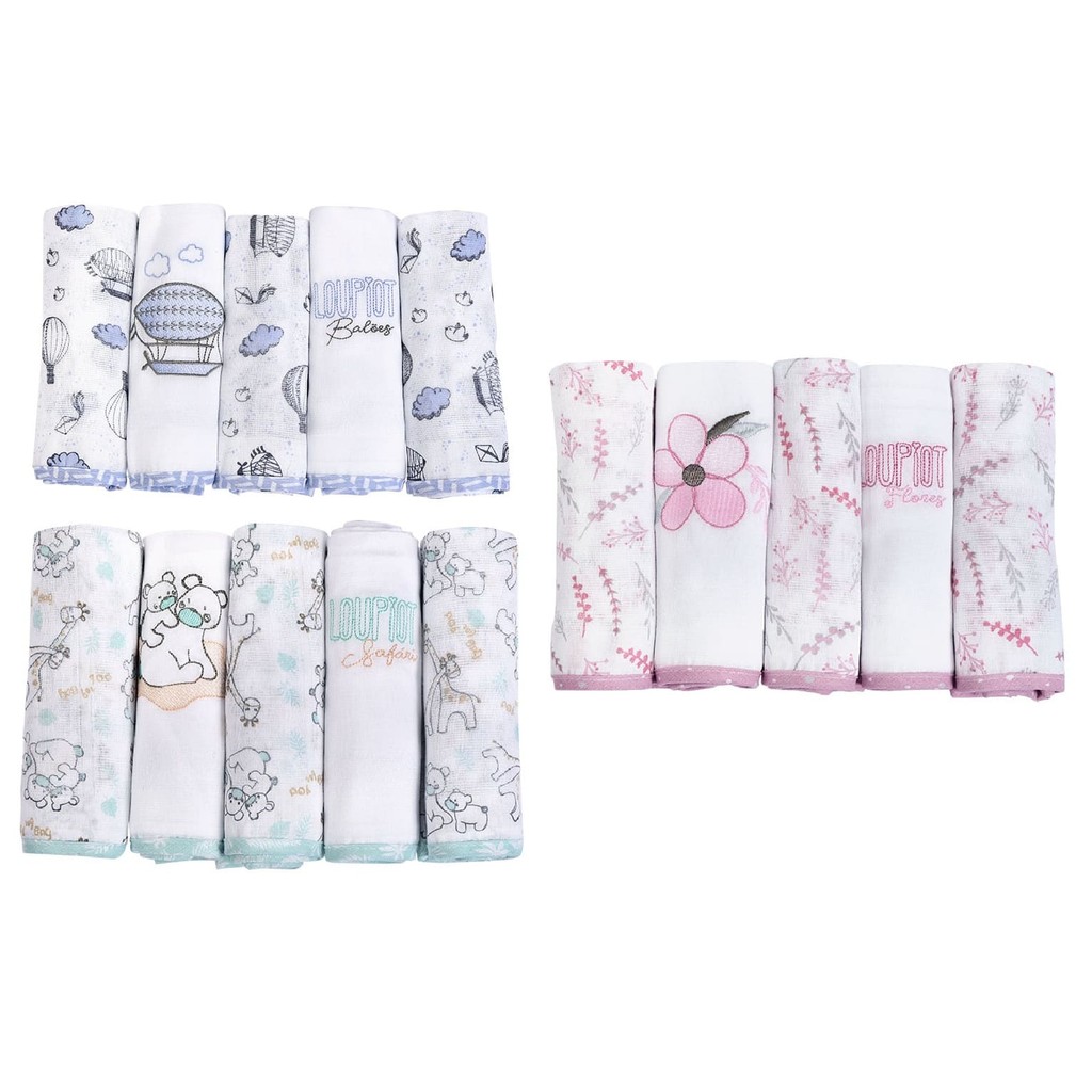 Kit Fralda de Pano para Bebê com Bainha 5 unidades 70x68 100% Algodão Premium Loupiot Temas Minasrey
