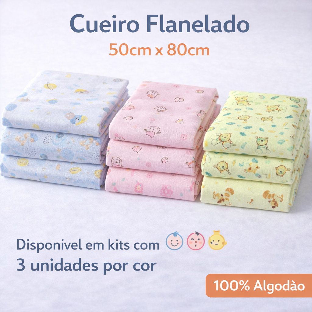 Cueiro Flanelado Bebê 100% Algodão Kit 3 Unidades 80cmx50cm Envio Imediato