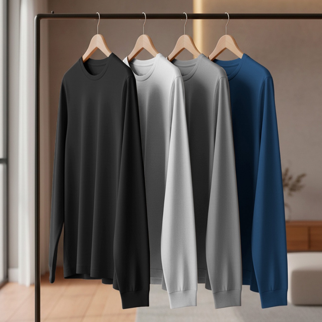 Kit 4 Camisetas Manga Longa 100% Algodão Masculina Slim Gola Redonda Lisa Inverno Manga Comprida Academia Trabalho