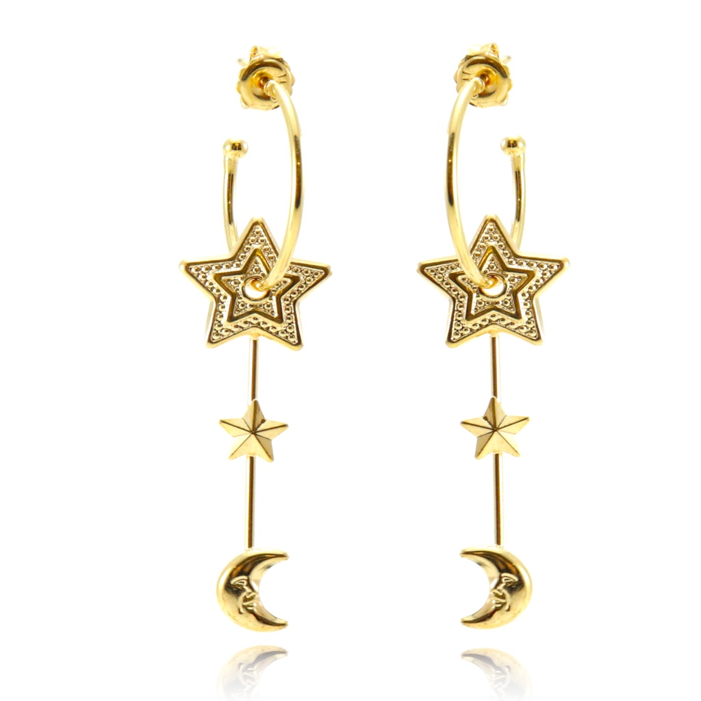 Brinco Argola Pingente Lua Estrela Folheado Ouro 18k