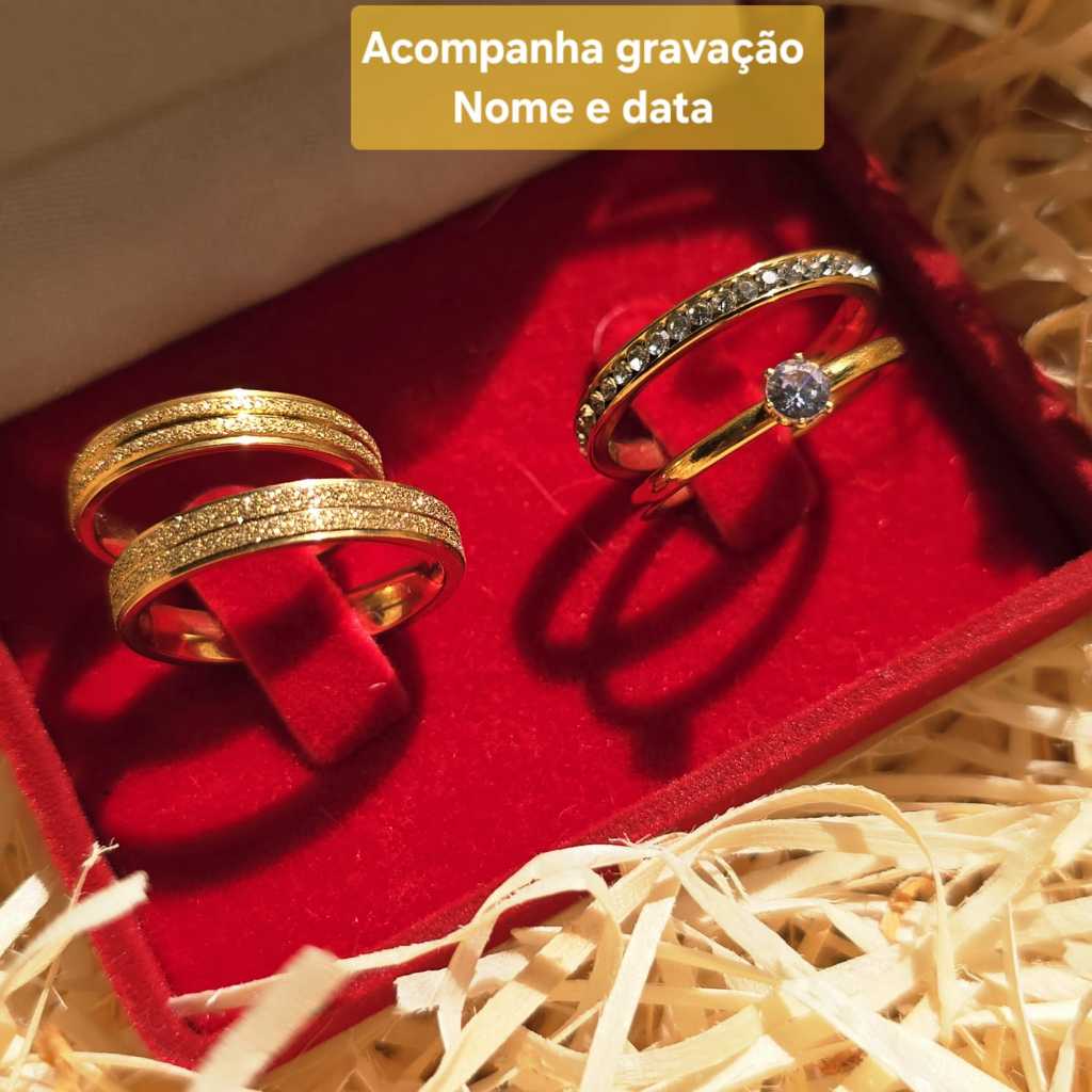 Par de alianças 4mm jateadas banhado a ouro 24k + Gravação + Anel solitário e Aparador (Cod-42)