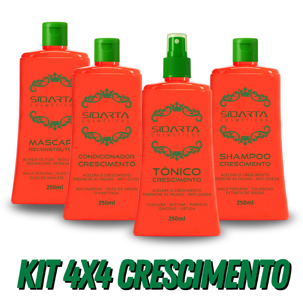 Kit Crescimento Capilar Sidarta 4X4 (F) – Tônico Capilar, Máscara Crescimento, Shampoo e Condicionador 250ML
