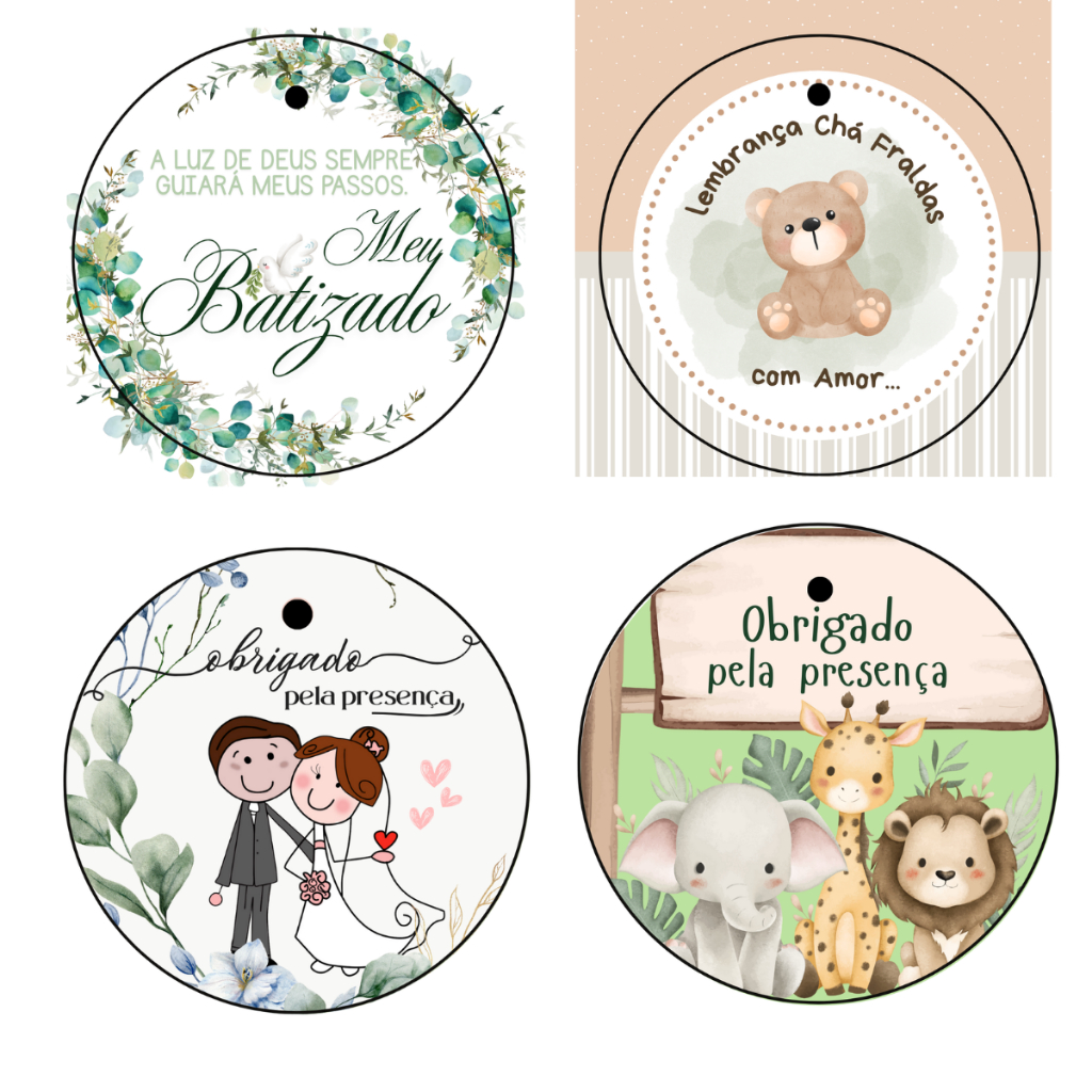 50 Tags Redondas 5x5 cm – Diversos Temas – Pronta Entrega