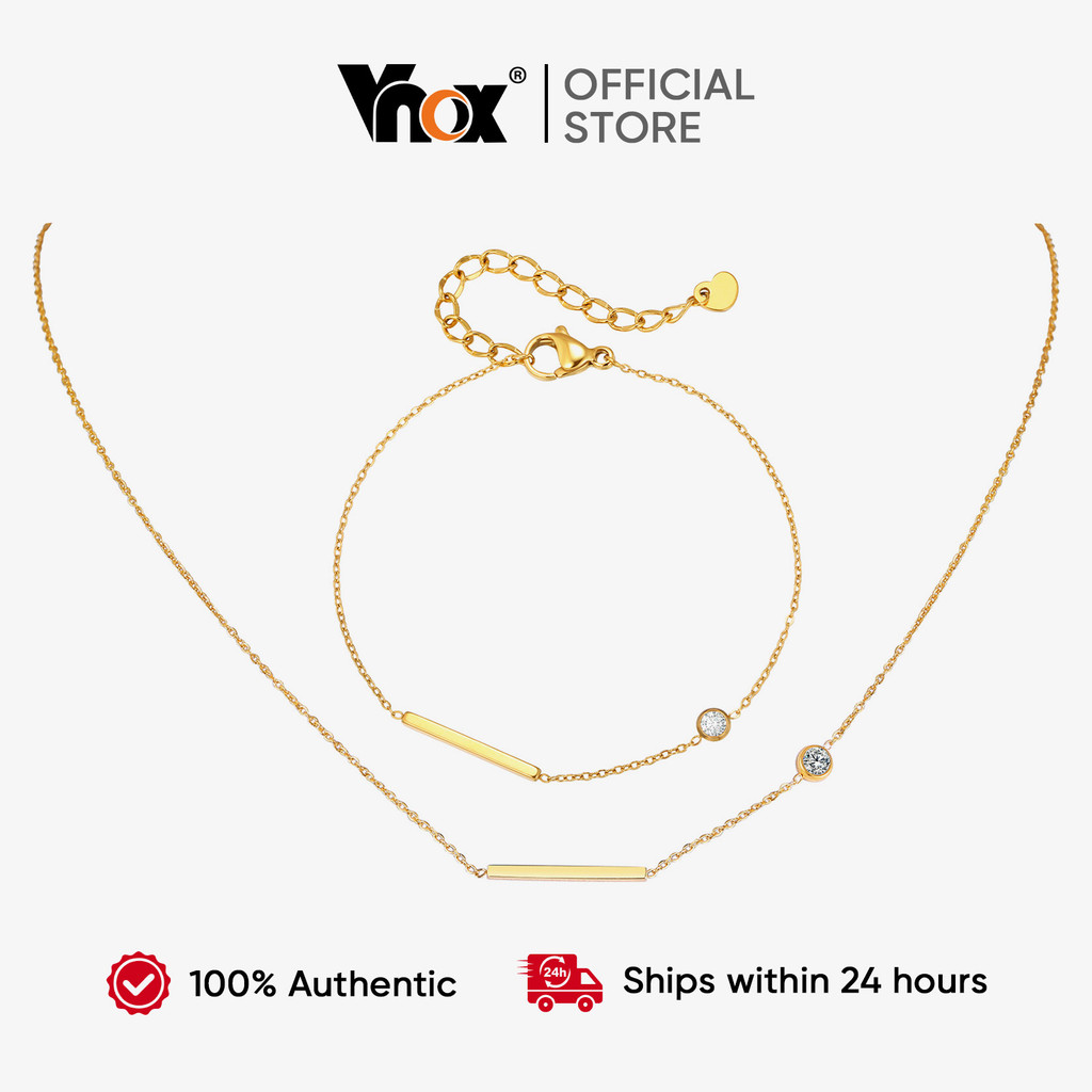 Vnox Ouro 2 Pçs Retangular Zircão Cúbico Pulseira Colar Conjunto Requintado Ajustável De Aço Inoxidável Hipoalergênico F