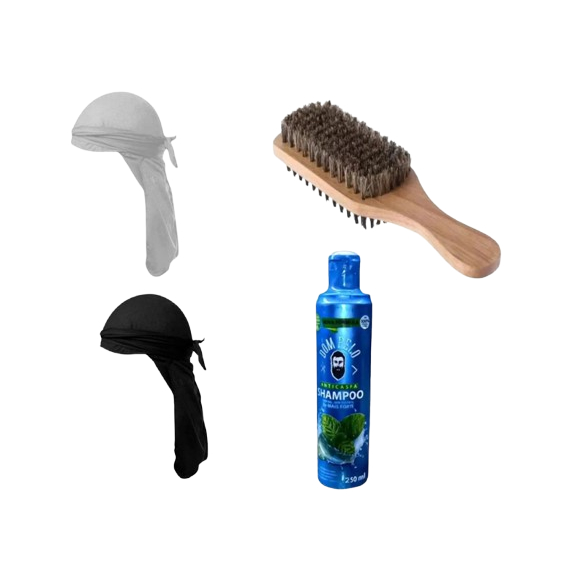 kit 2 Bandana Durag Dureg Waves Preta e Branca 1 Escova Dupla Javali 1 Shampoo Anticaspa
