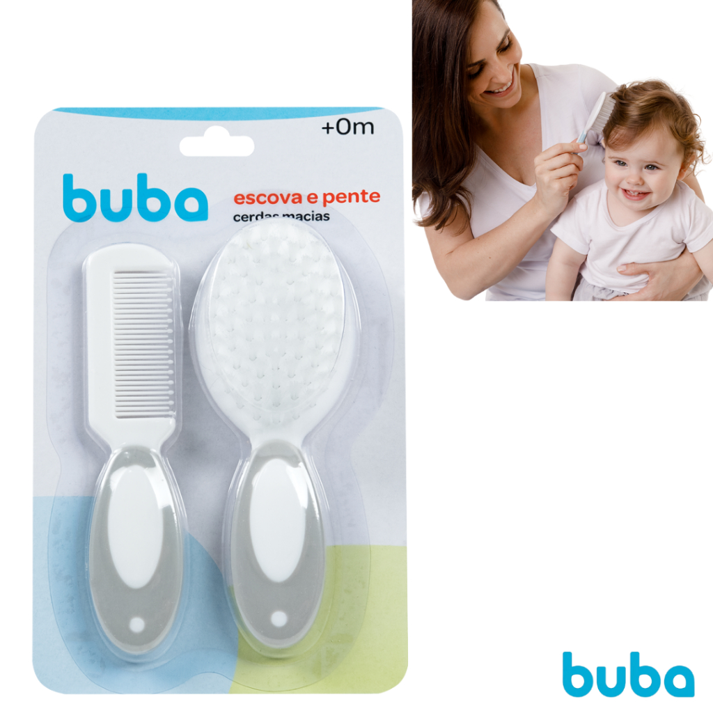 Kit Escova E Pente Cerdas Macias Pontas Arredondadas Para Cabelo Bebe Infantil Cinza Buba