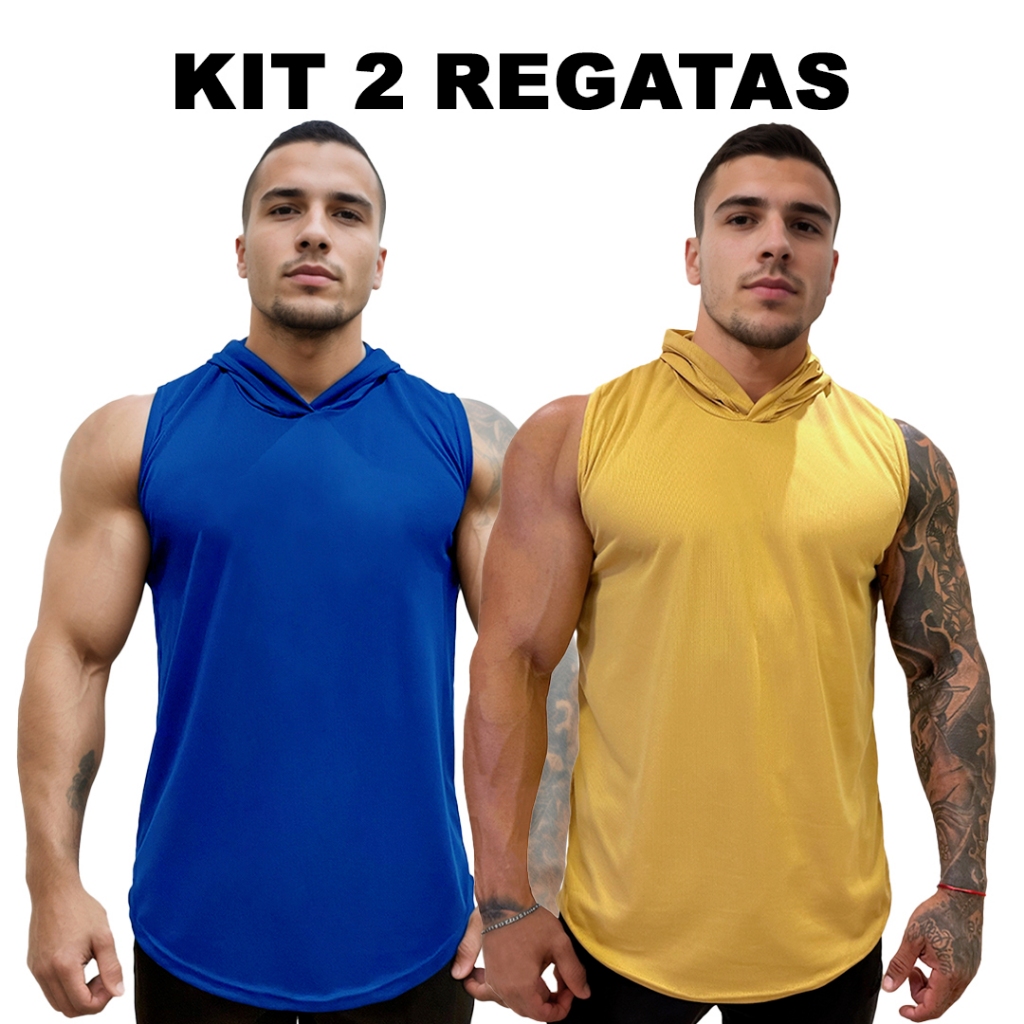 Kit 2 Regatas Azul Royal + Cores Masculina com Capuz em Dry Fit Lisa Sem Estampa Básica - Bombey
