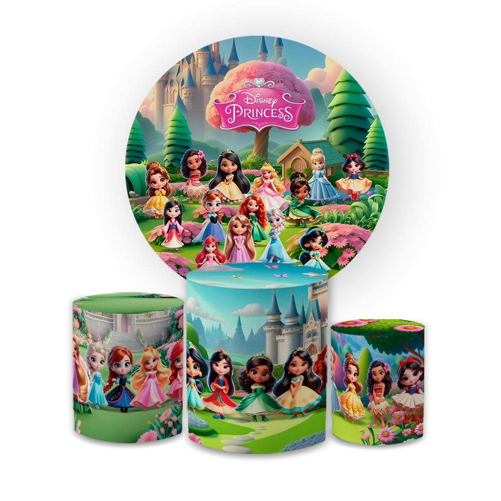 Painel Redondo E Capas De Cilindro Sublimados Helanca Premium Tema Princesas Feminino Kids Lançamento