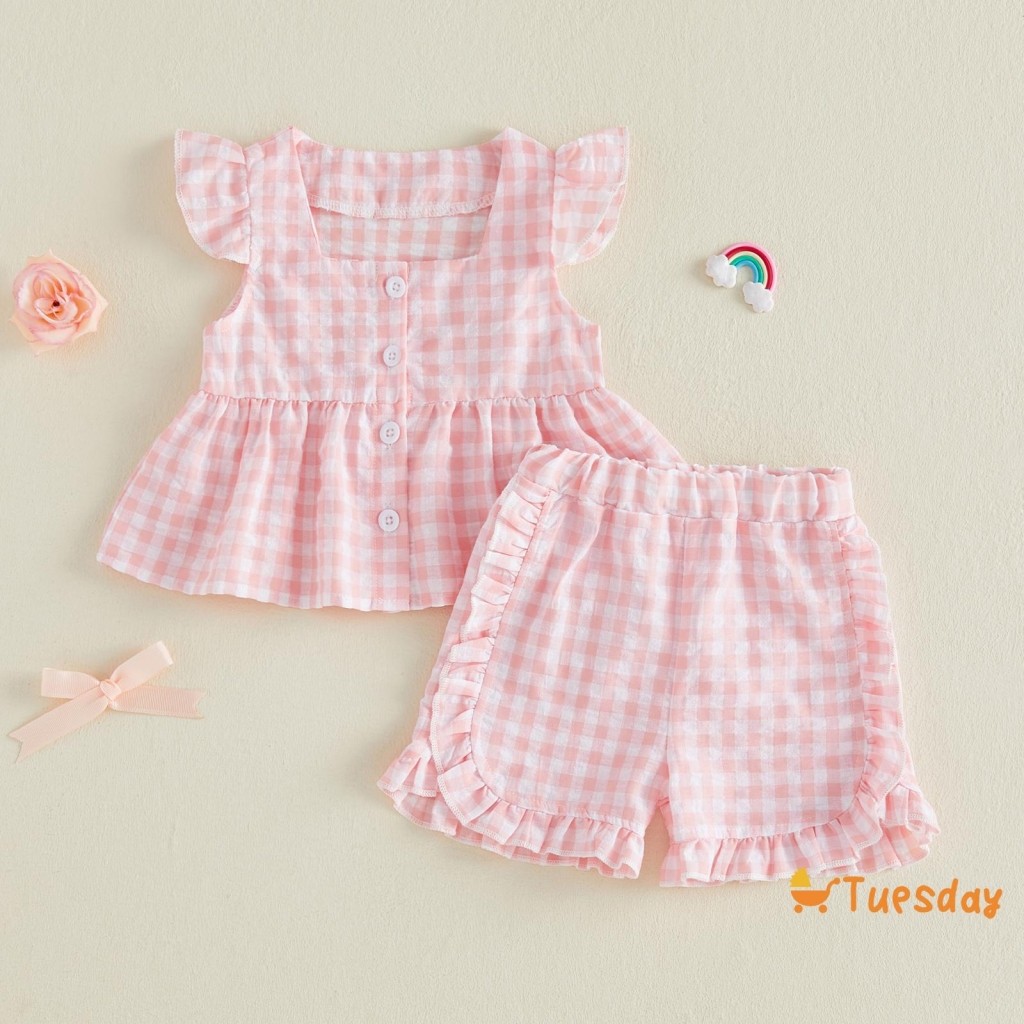 Conjunto De 2 Peças De Roupas Infantis Para Meninas , Verão , Manga Voadora , Gola Quadrada , Estampa Xadrez + Shorts De