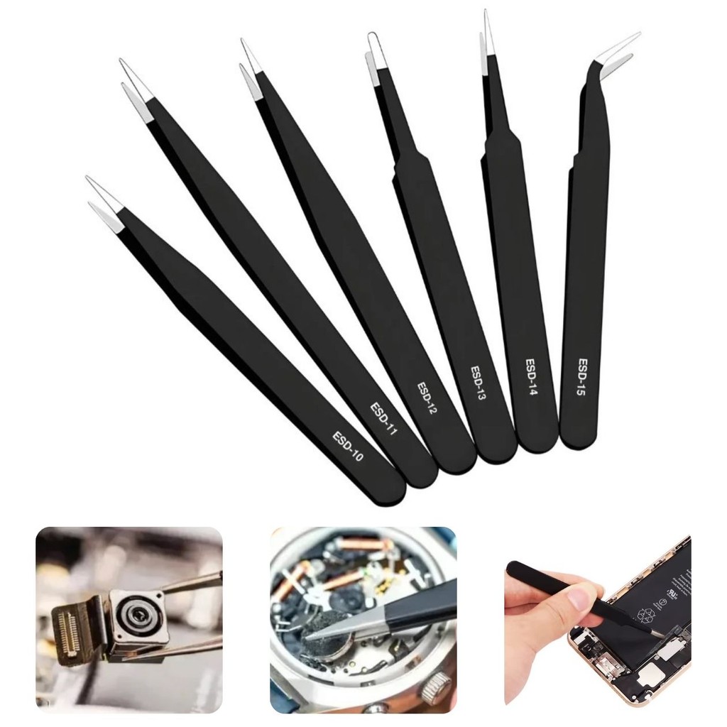 Jogo 6 Pinças Profissional Alta Precisão Anti Estática Curva Ferramenta Aço Inoxidável Artesanato Reparo Estética