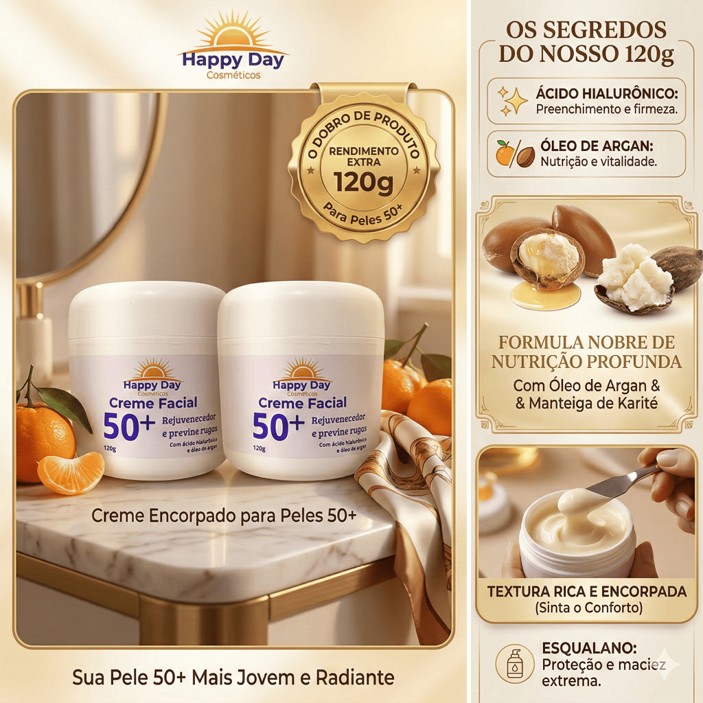 Kit 2 Creme Facial 50+ Ácido Hialurônico Antissinais Firmeza e Hidratação Happy Day 120g