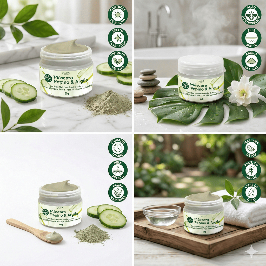 Máscara Facial Argila Verde e Pepino Clareadora Controle de Oleosidade Limpeza Profunda 60g Lucy's
